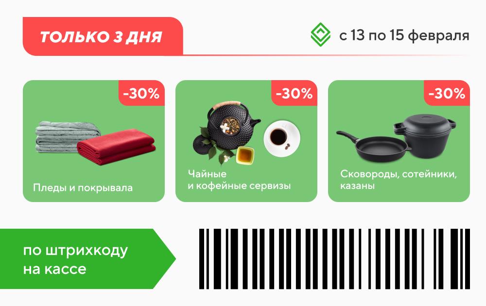 Только с 13 по 15 февраля. По штрихкоду — скидка 30% пледы, покрывала, сковороды, сотейники, казаны, чайные и кофейные сервизы. Успейте купить праздничные товары выгодно