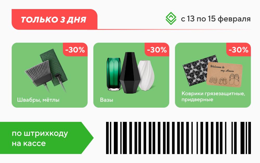Только с 13 по 15 февраля — скидка 30% на швабры, мётлы, вазы и придверные коврики. Акция действует по штрихкоду на кассе — спешите за праздничными покупками